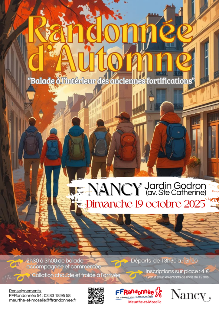 octobre 8, 2019 Randonnée d’Automne à Nancy le 19 octobre 2025 Dimanche 19 octobre 2025 au Jardin Godron de 13h30 à 15h00. Sur le thème « Balade à l’intérieur des anciennes fortifications ». Retrouvez tous les détails dans le flyer ci-dessous. Travel tips